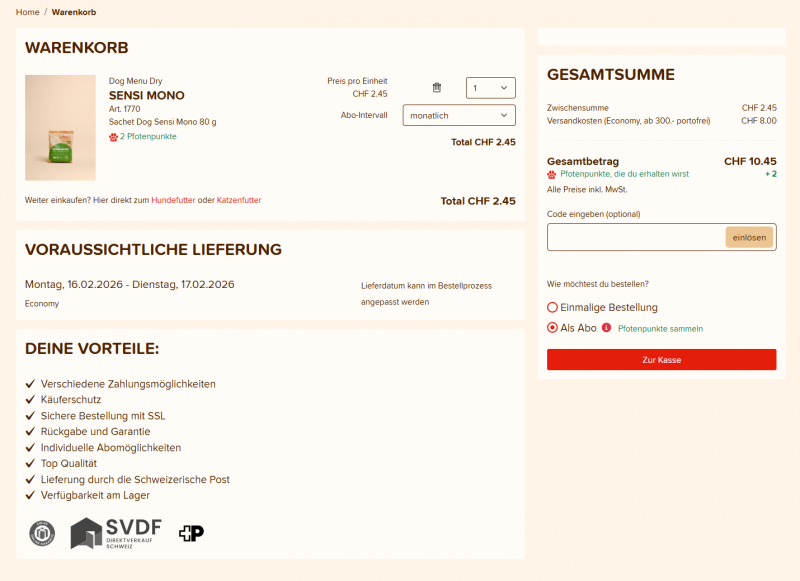 Bei jedem Einkauf erhältst du für jeden CHF 1 Bestellwert einen Pfotenpunkt. Bei Nachkommastellen wird ab 50 Rappen aufgerundet (z. B. eine Bestellung im Wert von CHF 9.30 gibt 9 Punkte, eine Bestellung im Wert von CHF 9.80 gibt 10 Punkte).